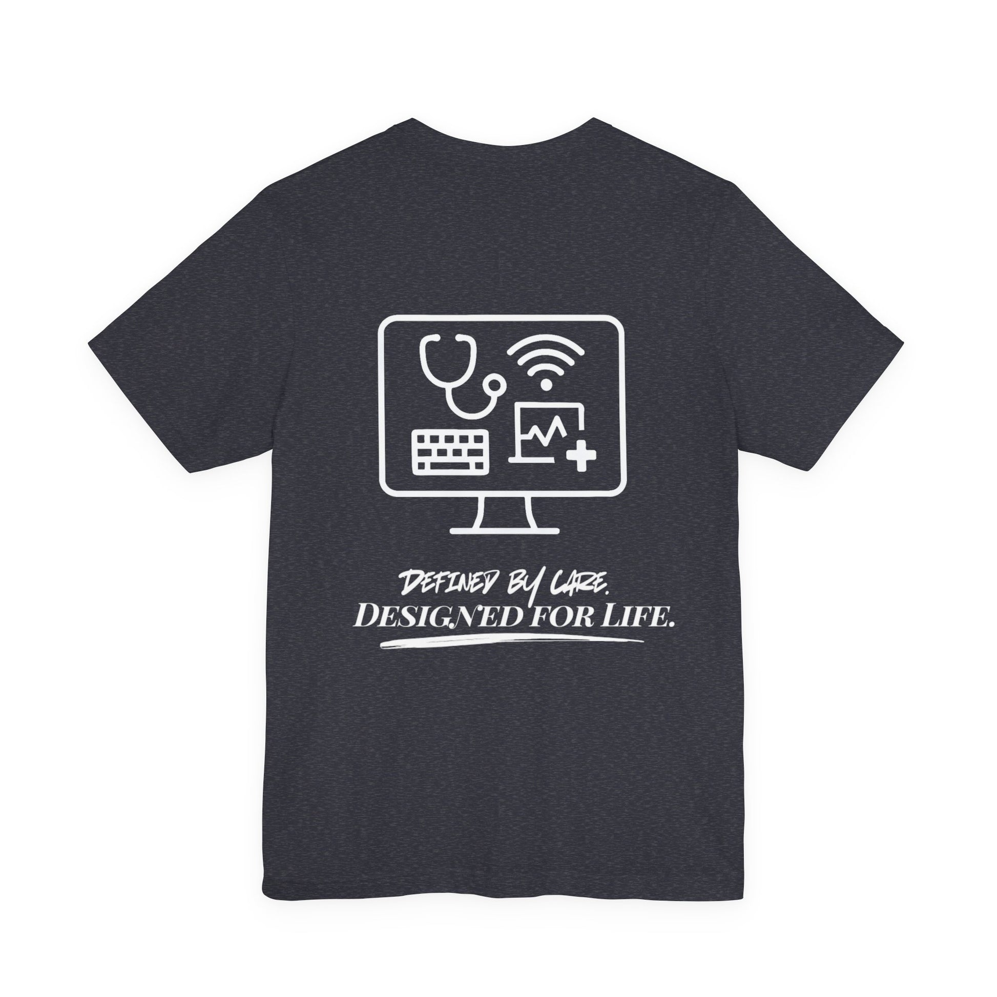 The Desktop Monitor Legacy Unisex Shirt features a logo outline filled with medical icons representing caring for the future of healthcare through technology and digital platforms. Each piece in the collection carries the mark of our slogan, "Defined by Care. Designed for Life." -blending timeless style with the heart of healthcare. Telehealth RNs, Informatics Nurses, Case Managers, Utilization Review Nurses, Chart Auditors, Health IT Specialists, and every remote healthcare pro keeping care connected.