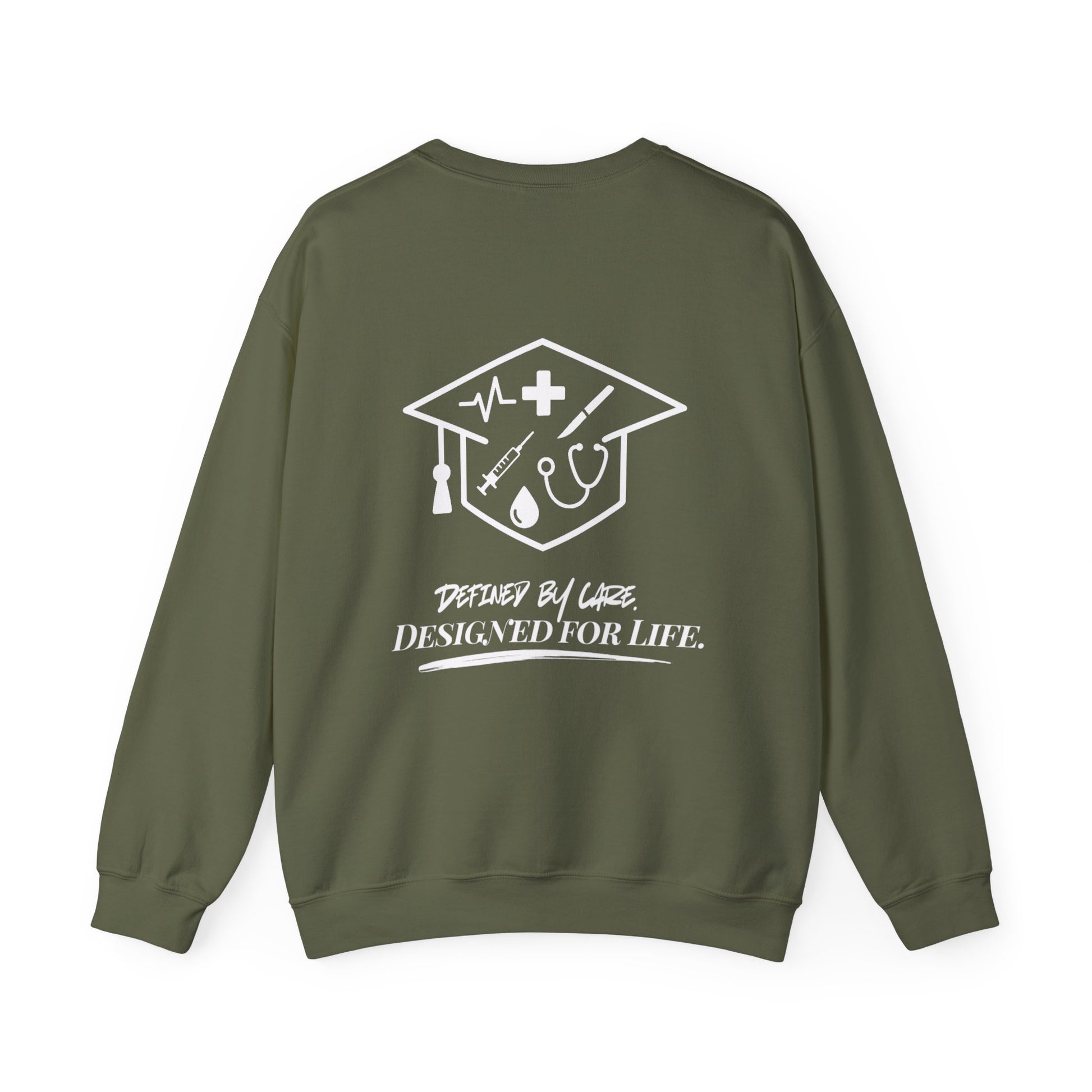 The Graduation Cap Legacy Silhouette Unisex Sweater features a logo outline filled with medical icons, symbolizing the lifeline of healthcare. Each piece in the collection carries the mark of our slogan, "Defined by Care. Designed for Life." -blending timeless style with the heart of healthcare. Suitable for our health professional graduates chasing that next milestone.