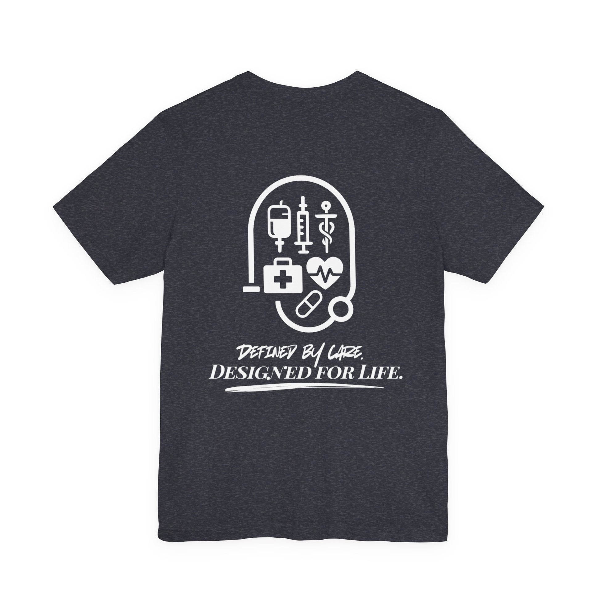The RNecessities Logo Legacy Silhouette Unisex Shirt features a logo outline filled with medical icons, symbolizing the lifeline of healthcare. Each piece in the collection carries the mark of our slogan, "Defined by Care. Designed for Life." -blending timeless style with the heart of healthcare. All healthcare professionals — Nurses, Techs, Therapists, Physicians, Students, and Support Staff — who embody care in every form.