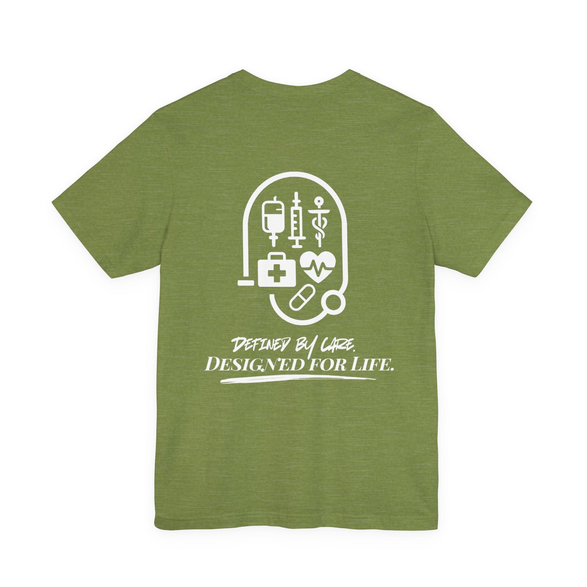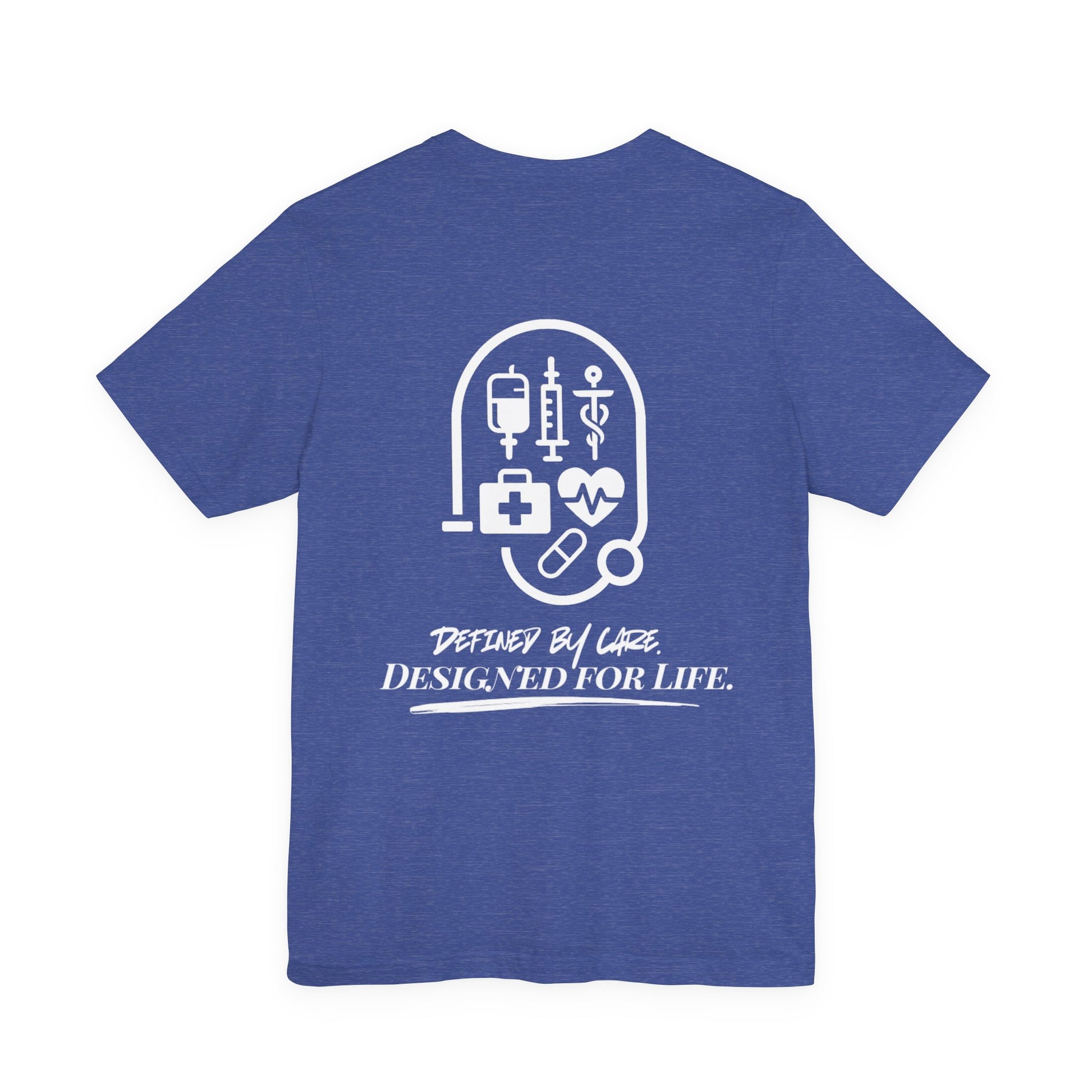 The RNecessities Logo Legacy Silhouette Unisex Shirt features a logo outline filled with medical icons, symbolizing the lifeline of healthcare. Each piece in the collection carries the mark of our slogan, "Defined by Care. Designed for Life." -blending timeless style with the heart of healthcare. All healthcare professionals — Nurses, Techs, Therapists, Physicians, Students, and Support Staff — who embody care in every form.