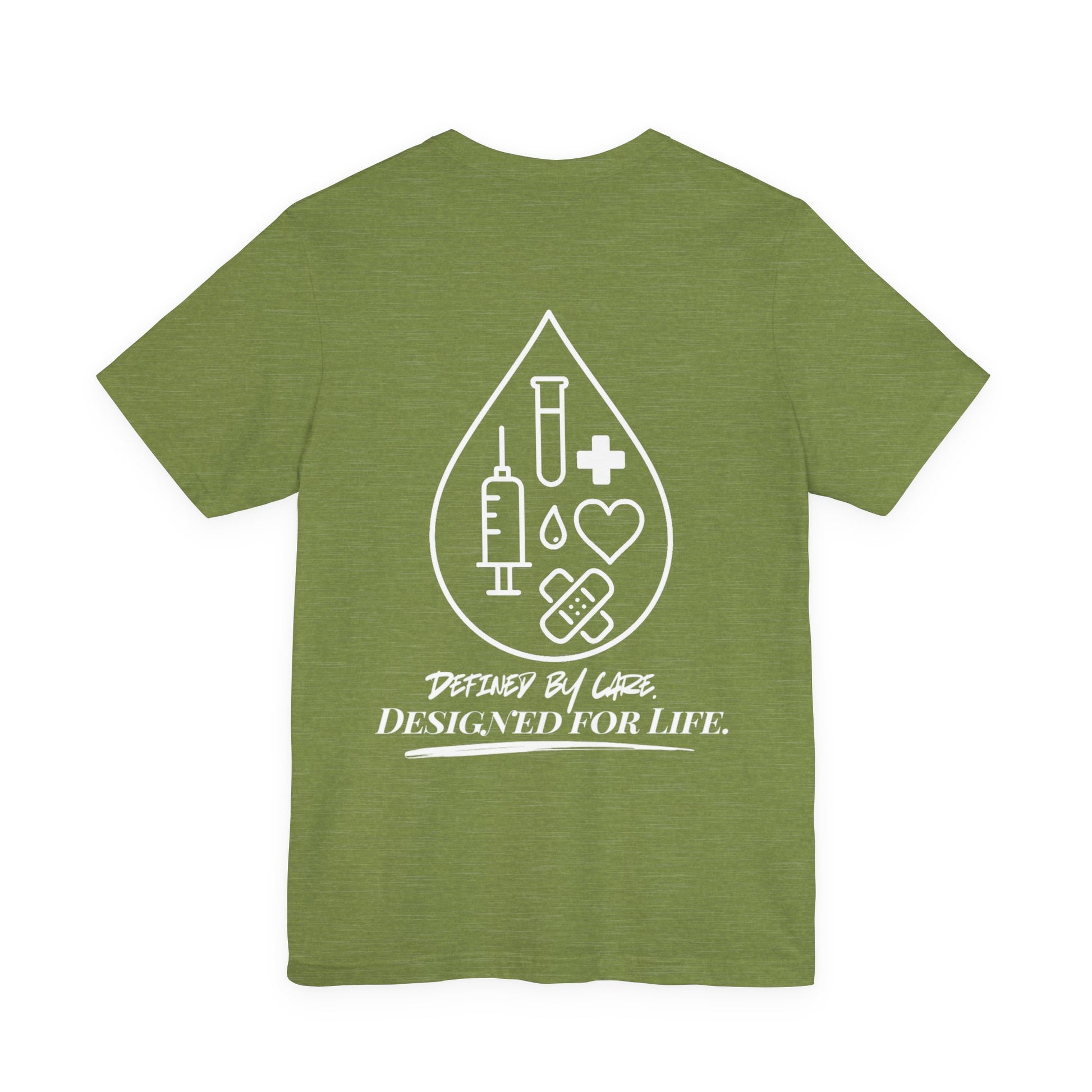 The Blood Droplet Legacy Unisex Shirt features a logo outline filled with medical icons honoring the lab professionals who keep the system running. Each piece in the collection carries the mark of our slogan, "Defined by Care. Designed for Life." -blending timeless style with the heart of healthcare. Phlebotomists, Lab Techs, Blood Bank Specialists, Donor Nurses, Hematology Staff, and every healthcare professional who draws, tests, or saves through blood.