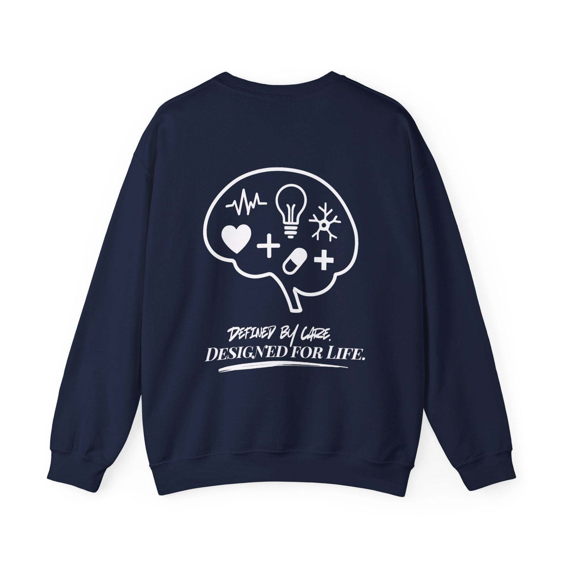 The Brain Legacy Unisex Sweater features a logo outline filled with medical icons symbolizing knowledge, resilience, and care. Each piece in the collection carries the mark of our slogan, "Defined by Care. Designed for Life." -blending timeless style with the heart of healthcare. Neurology Teams, Psych Nurses/Techs, Mental Health Therapists, Neuro Surgeons, and every professional caring for the mind as much as the body.