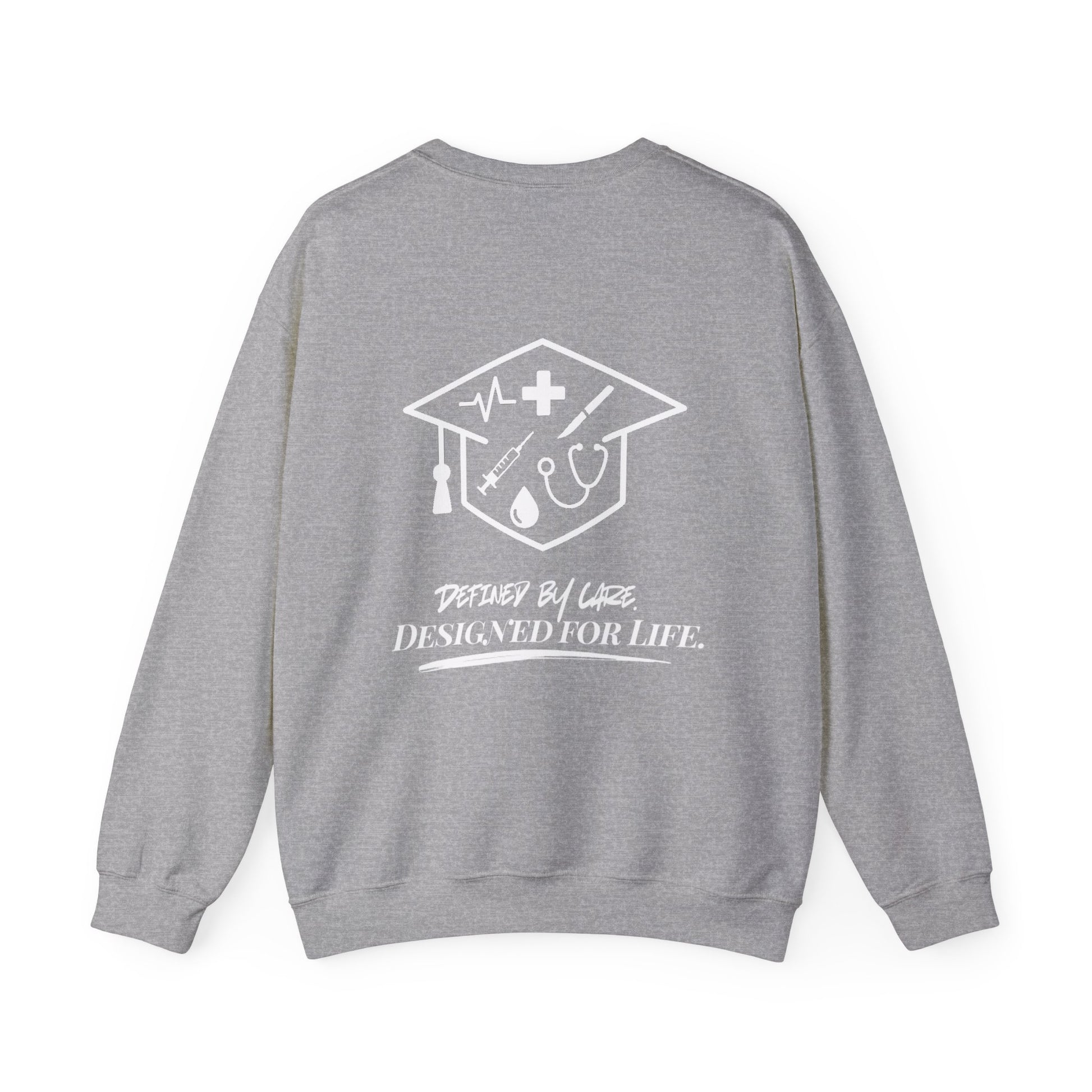 The Graduation Cap Legacy Silhouette Unisex Sweater features a logo outline filled with medical icons, symbolizing the lifeline of healthcare. Each piece in the collection carries the mark of our slogan, "Defined by Care. Designed for Life." -blending timeless style with the heart of healthcare. Suitable for our health professional graduates chasing that next milestone.
